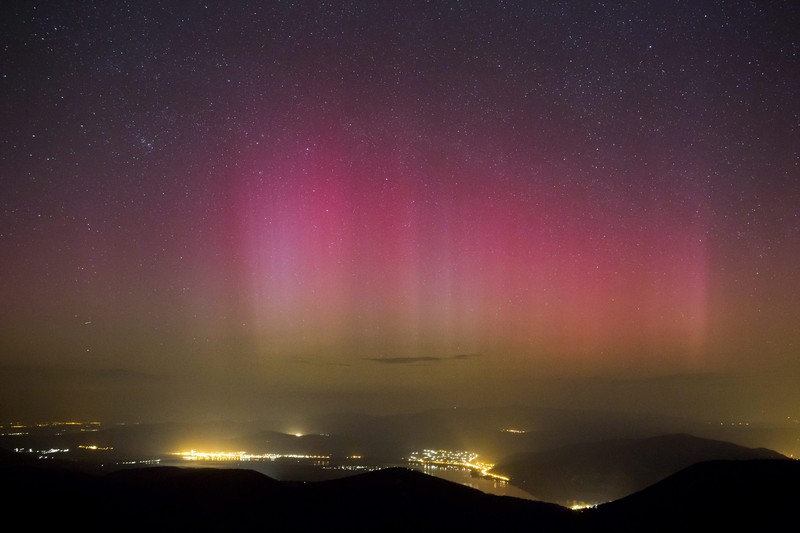 Sarki fény (aurora borealis) a dobogókői kilátóból fotózva. Fotó: Mohai Balázs/MTI